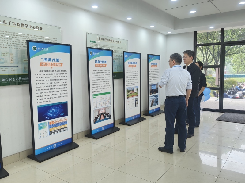 七十载薪火相传,数智化谱写新篇。作为浙江师范大学70周年校庆系列活动的重要组成部分,智慧校园建设成果展于4月18日在20幢教学楼一楼正式开展。本次展览由信息技术中心精心策划,通过图文展板与语音解说相结合的方式,系统展示了“十四五”以来学校在教育数字化转型方面的探索与成效。一、夯实网络基座,构建高速信息通道学校投入2100余万元,完成全校60幢公寓及教学楼的全光网络改造,并建成全省首个5G校园IPv6双域专网,为师生教学、科研与生活提供了稳定高速的网络环境。二、打造“浙师大脑”,实现一站式便捷服务依托“浙师大脑”,网上办事大厅集成160余项微应用,40余套业务系统实现单点登录,师生“一次登录,全