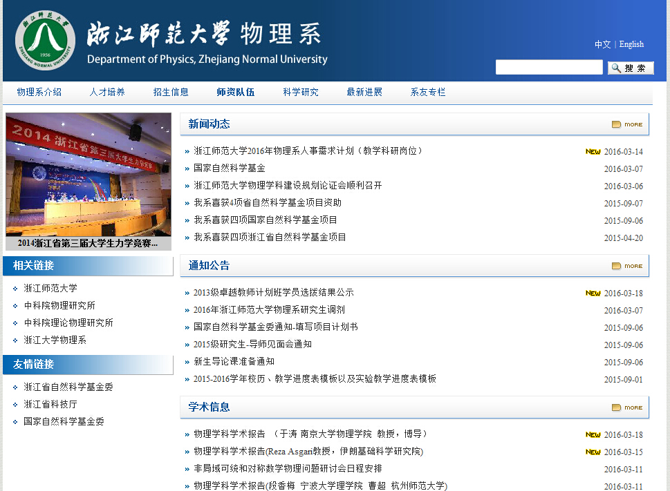 数理信息学院物理系通过网站群系统在进行了设计与完成,主要栏目包括物理系介绍、人才培养、招生信息、师资...
